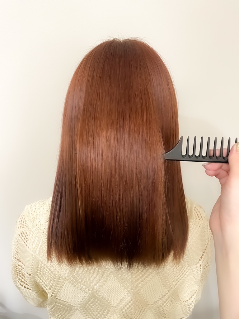 髪の毛にトリートメントを吸着させるためにストレートアイロンで熱を入れています。